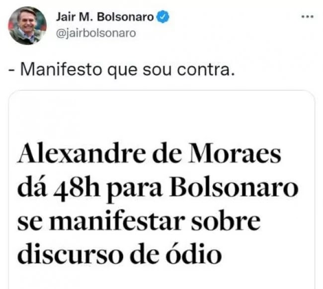 O vice-presidente do Tribunal Superior Eleitoral (TSE), ministro Alexandre de Moraes, concedeu nesta sexta-feira (15) o prazo de dois dias para que o presidente Jair Bolsonaro se manifeste sobre a ação protocolada pelo PT e outros partidos oposicionistas envolvendo suposto “discurso de ódio e incitação da violência”.